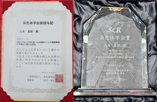 染色体学会第75回年会(令和6年度、神奈川大学)において、受賞題目「DNA Fiber FISH法による植物ゲノムの微細構造の可視化に関する研究」に対して、優れた業績が認められ授与されたもので、現地で授賞式と受賞講演が行われました。以下は、山本教授のコメントです。