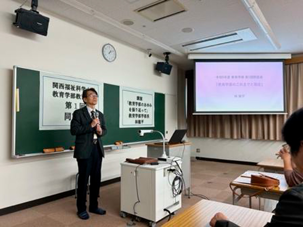 教育学部の第1回目の記念講演として、当時の学部長の林龍平先生より「AI時代における学校と教育」という内容のご講演をいただきました(写真1、2)。